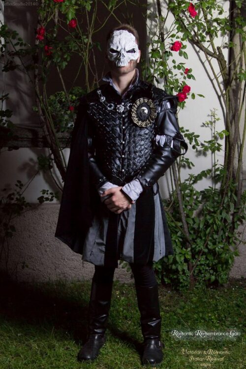 Renaissance inspired costume, in black pleather, velvet and pearls.