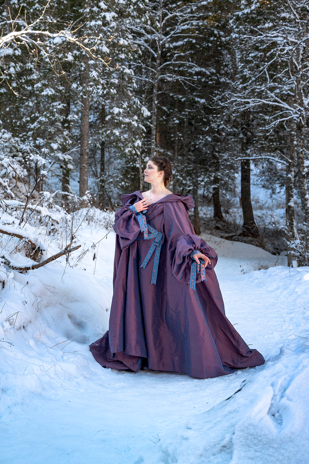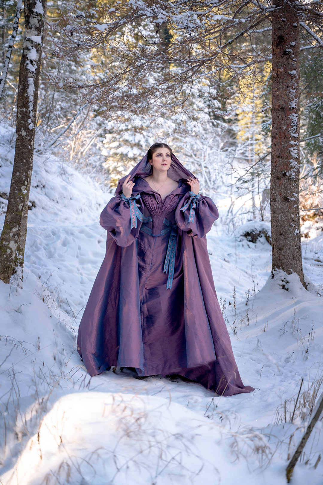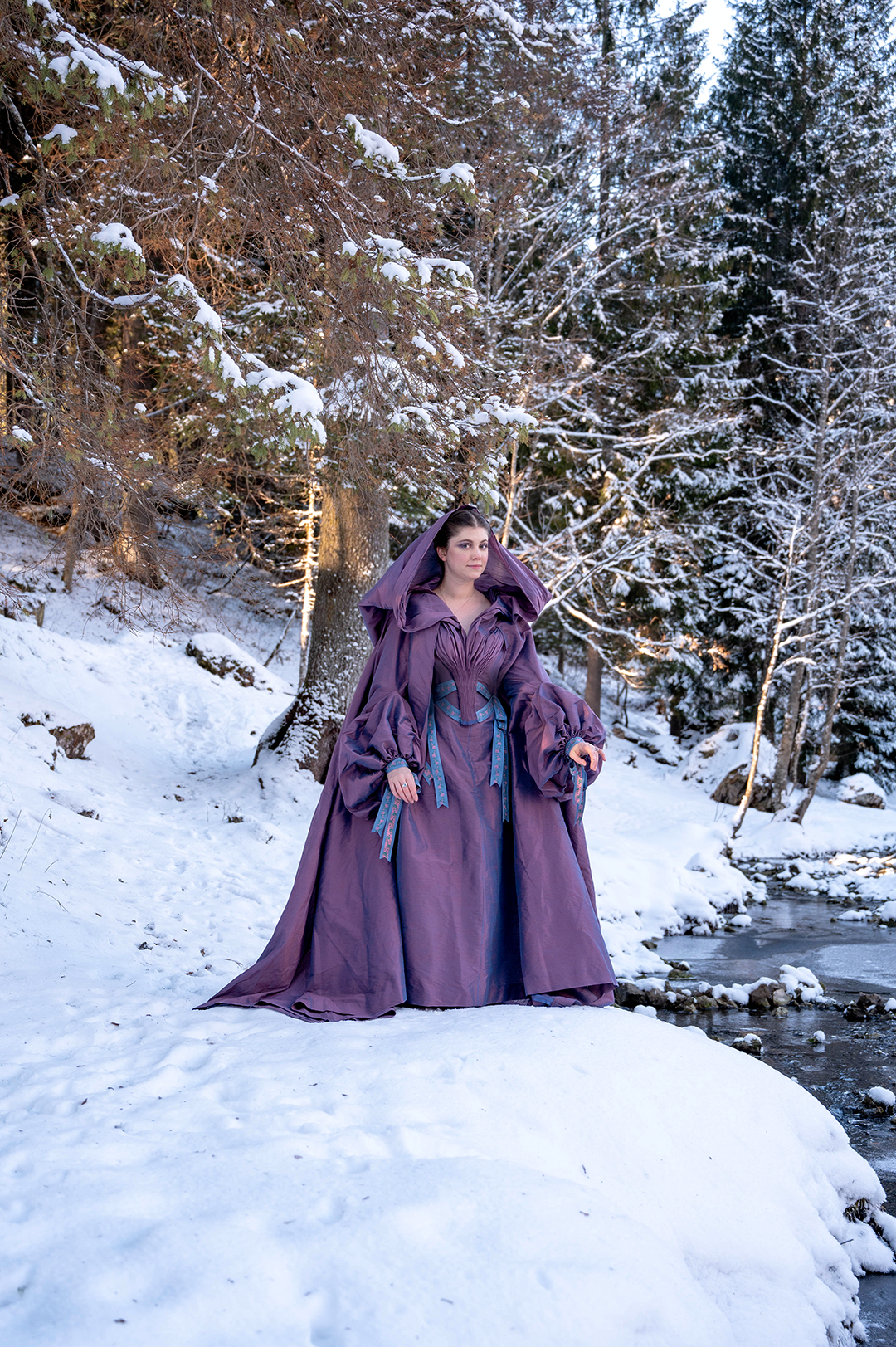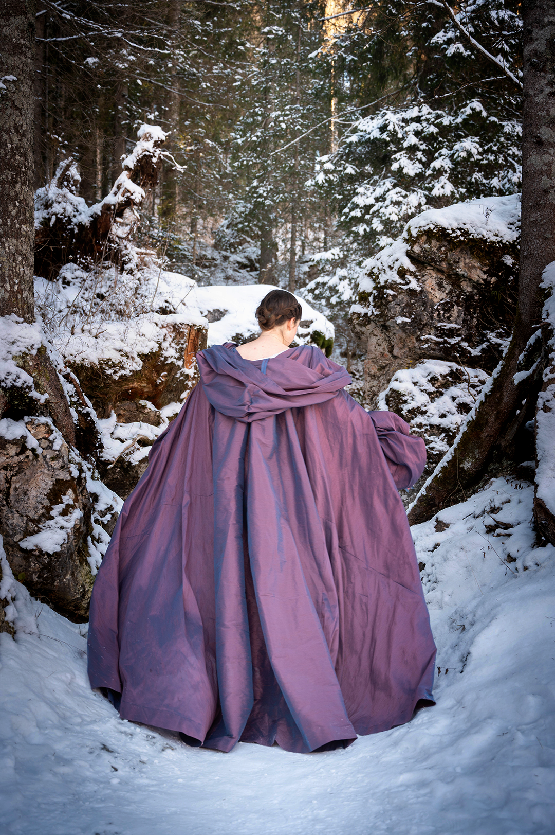 In these photographs, the cape is worn over a thick fleece hoodie (pulled down at the back), sweatpants, and trainers. No corset. No dress. No historical layers. That said, the Bovarysme Cape truly shines when styled with a proper corset, a hoop skirt, or a historical dress.