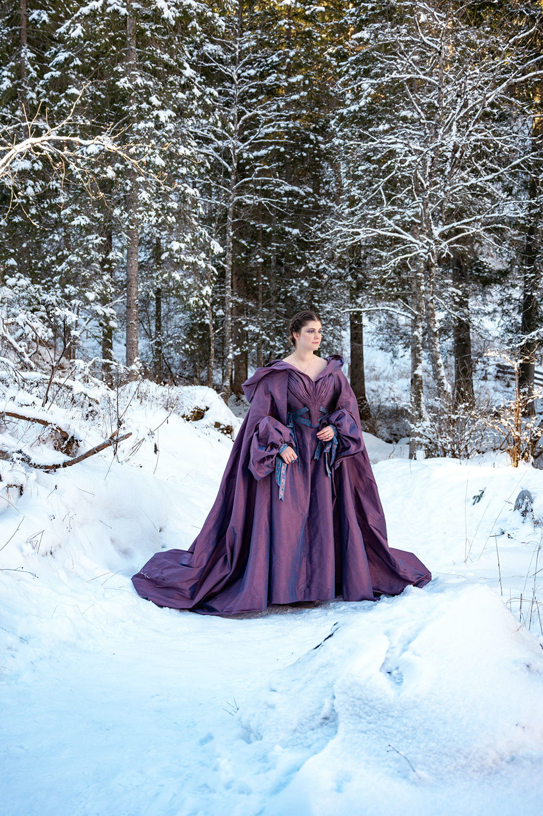 The Bovarysme Cape is constructed using twelve meters of dupion fabric in a pink shot blue iridescent shade. The color shifts between purple and bronze tones depending on the light, creating a luminous, almost magical effect.