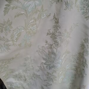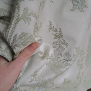 So here you have a wonderful brocade satin, in the palest green with vines and flowers. The sleeves will be full and flowy, well supported, the front of the dress and the inner sleeves will be in smocked cotton muslin dyed to a pale yellow, the lining of the sleeves and the belt will be in pastel pink. The bottom hem will be lightly reinforced with historically accurate techniques to make it flare beautifully.