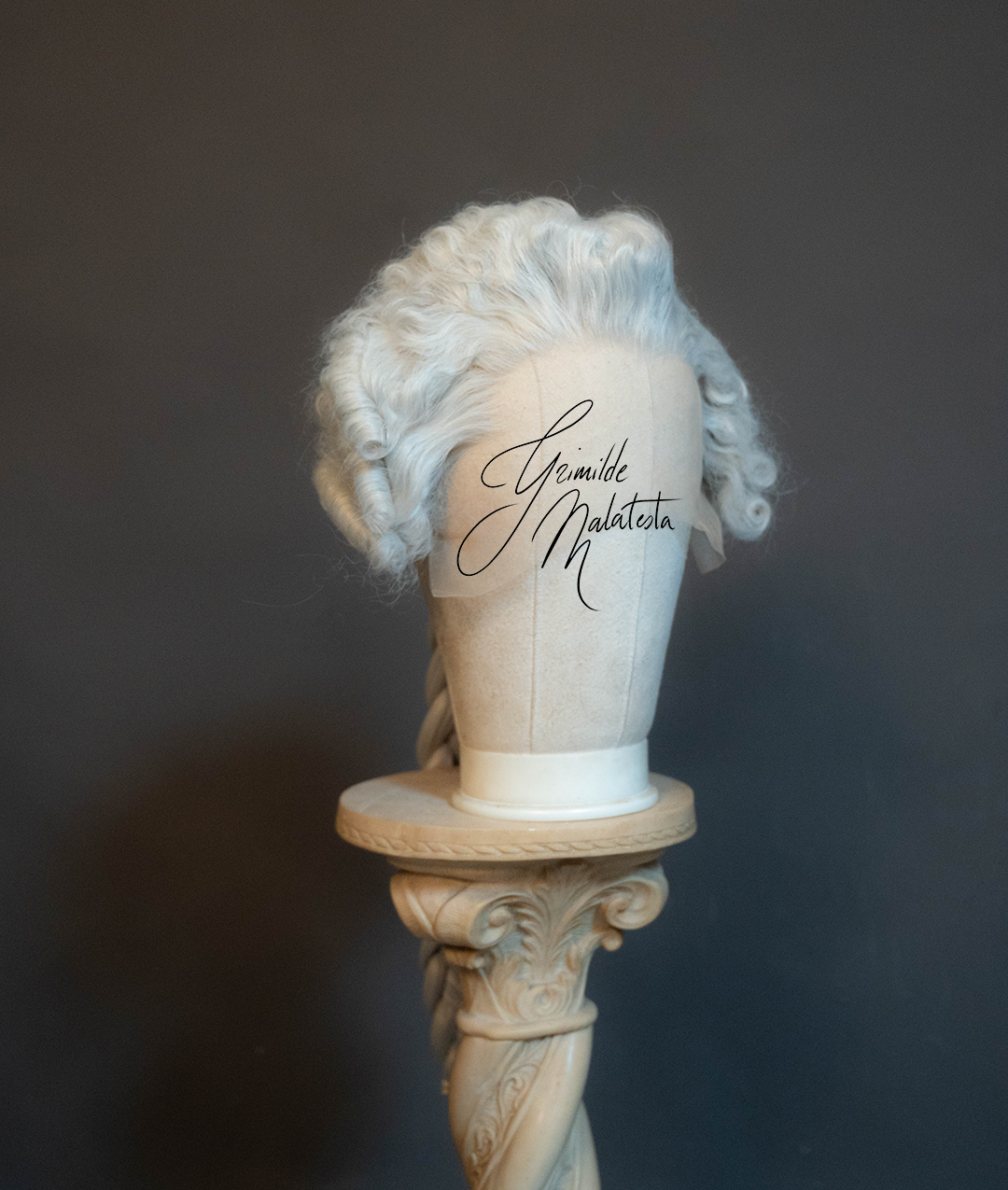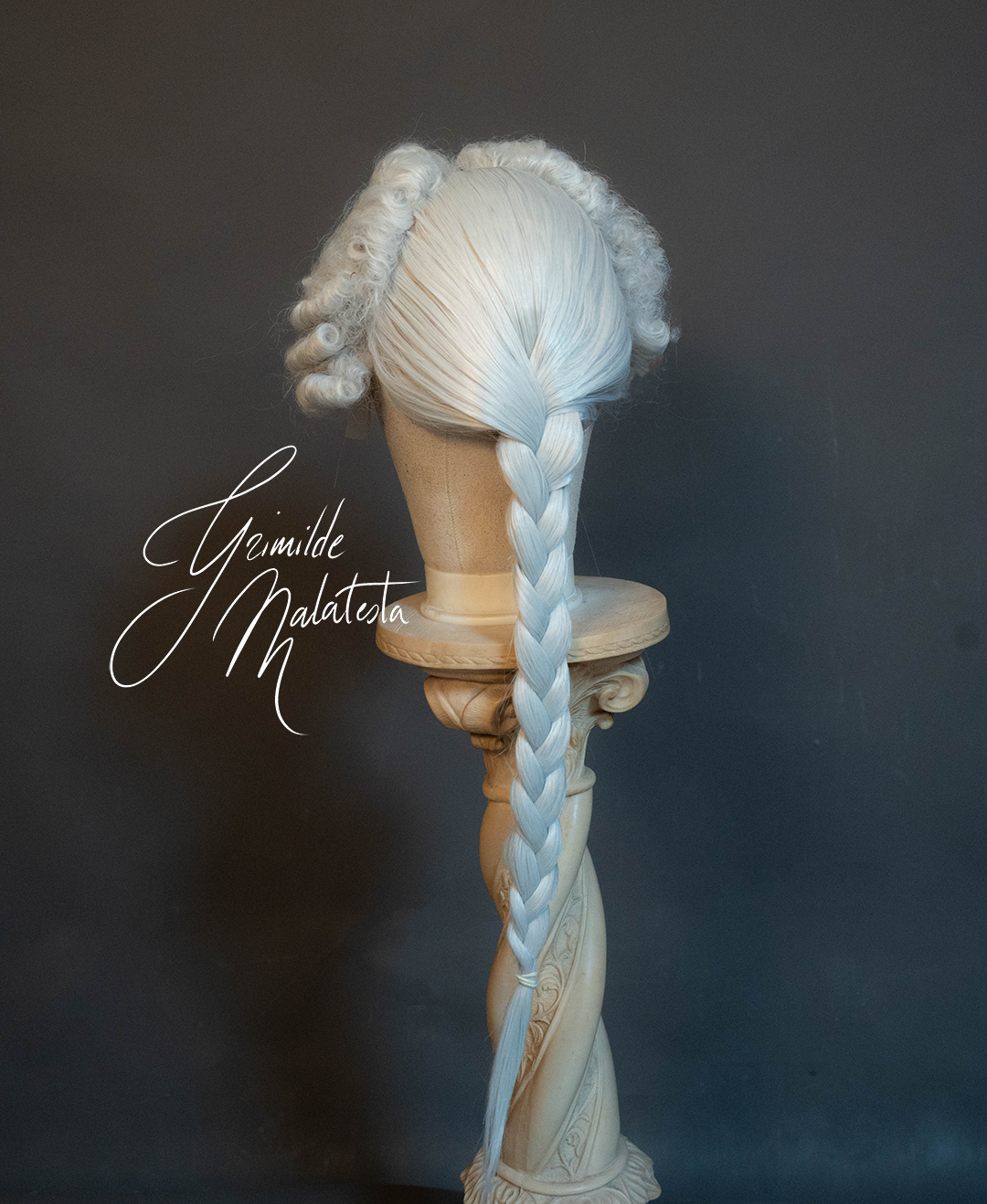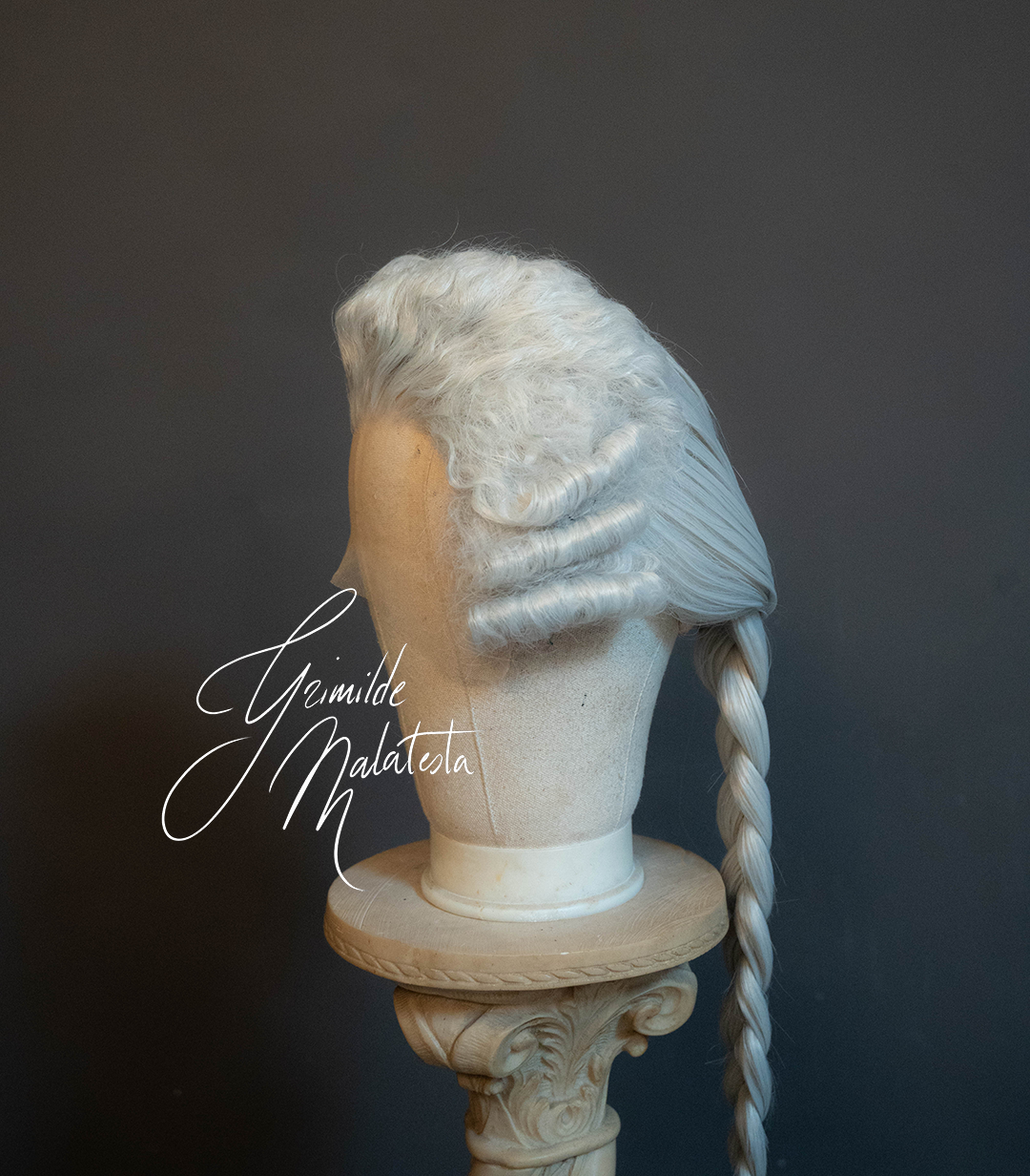 This light grey wig features a braid at the back, a less seen styling in nowadays replicas, but very popular and deemed very masculine at the time. In fact, most military uniforms featured braids at the back, that were covered in a black ribbon. You can add yours, with a bow at the top, or complete it with a bag, or other styling choices, you just need to add a little something to cover the elastic that secures the end of the hair.