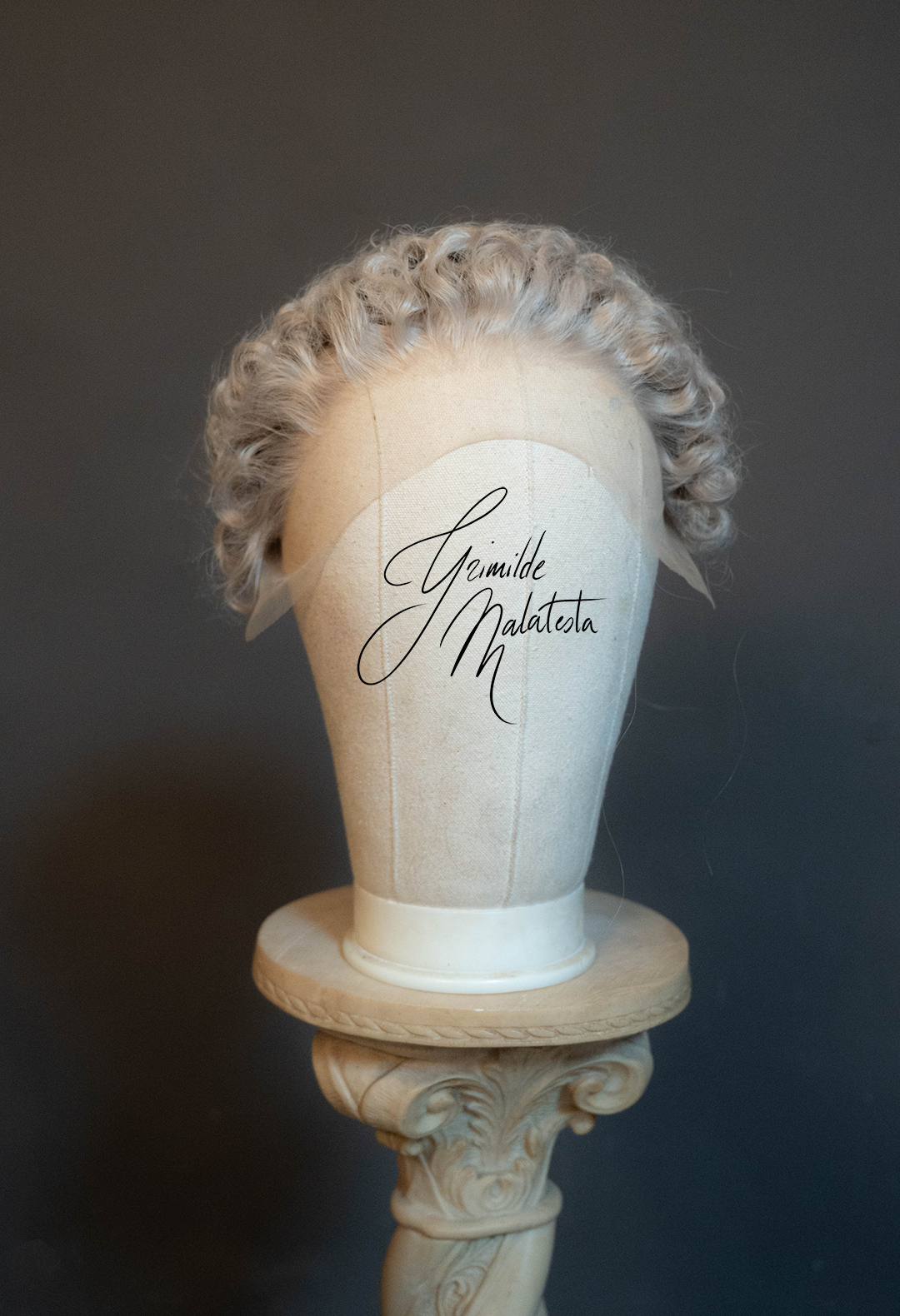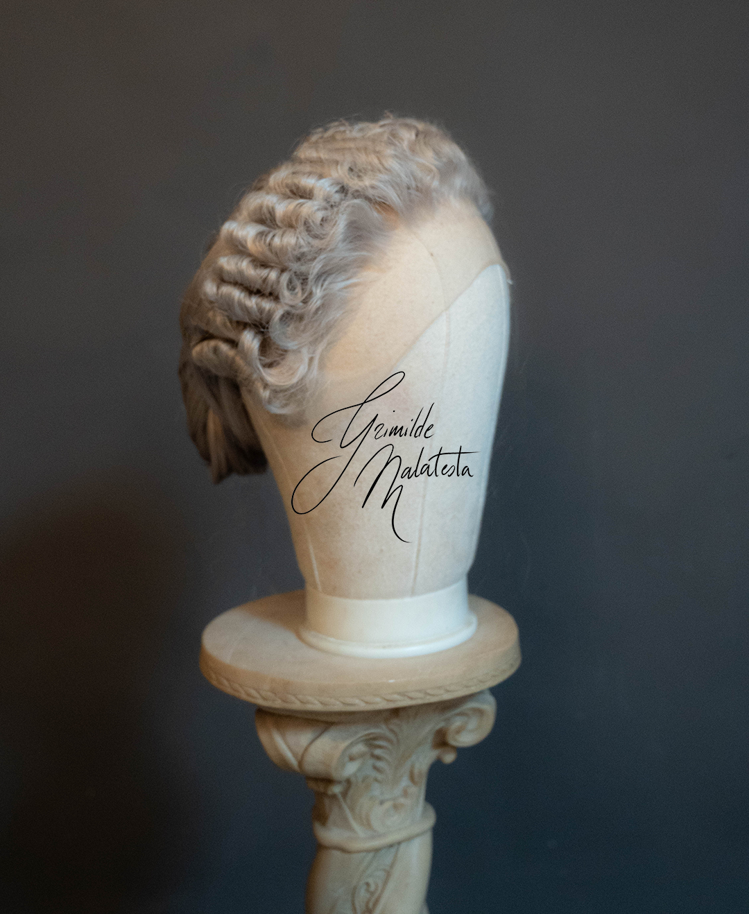 Hand-styled as a lace front synthetic wig, it features a classical tete-de-mouton hairstyle, which is typical of the middle decades of the 18th century.