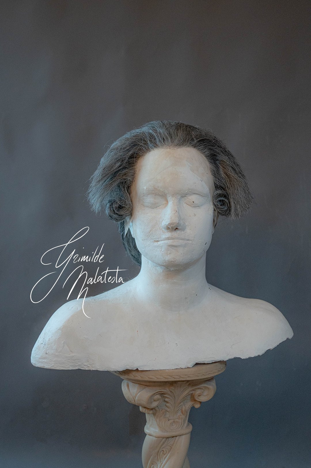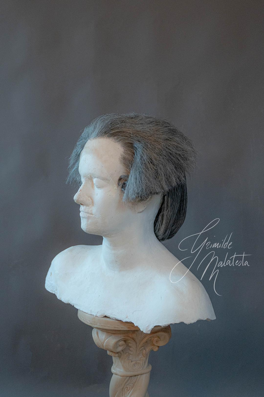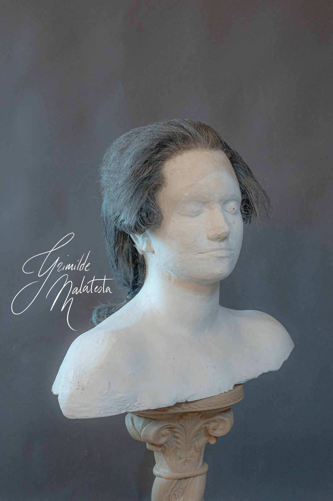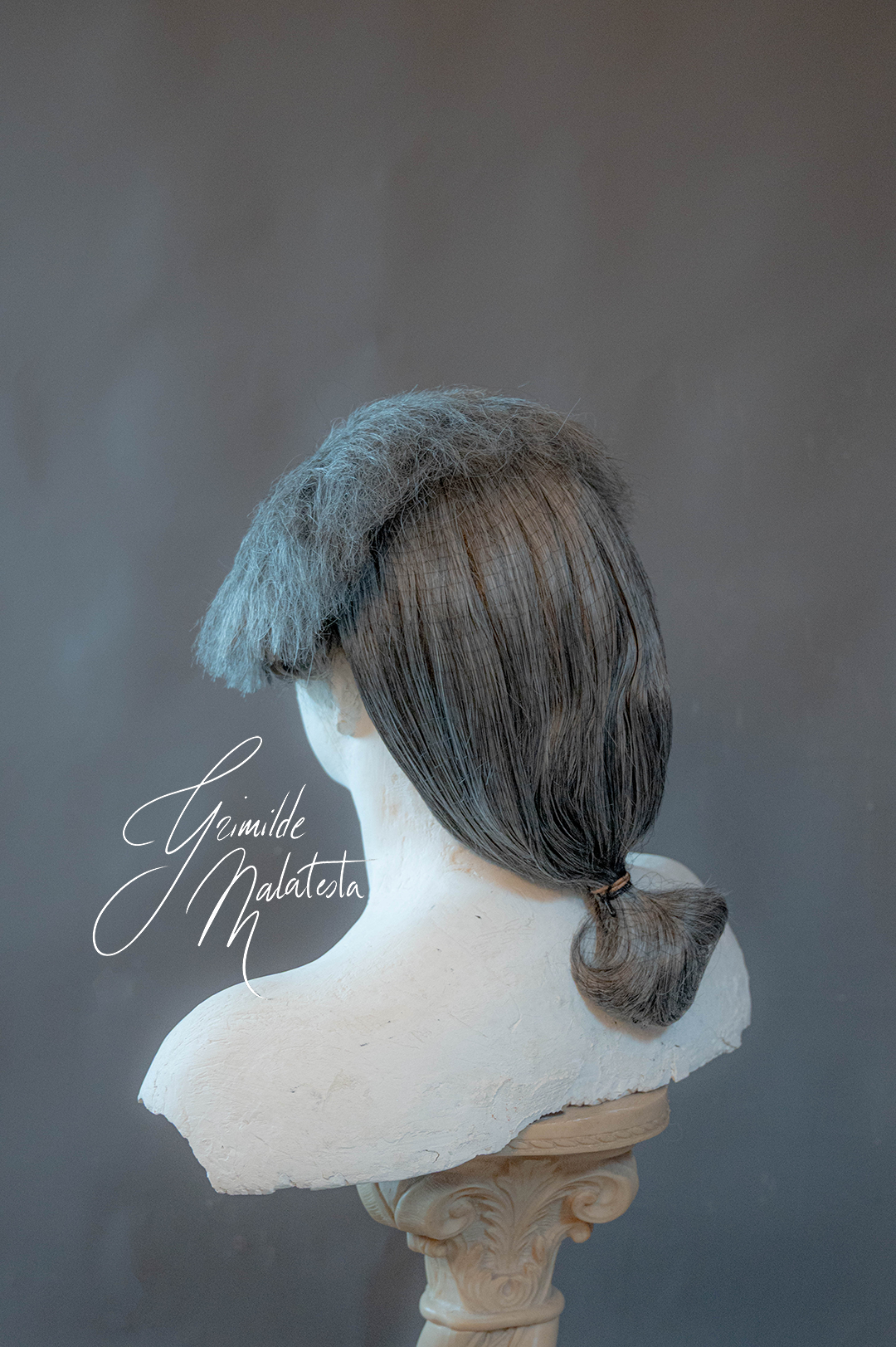 This light grey wig features a frizzy and short cut top, a less seen styling in nowadays replicas, but very popular and deemed very masculine at the end of the 18th century.