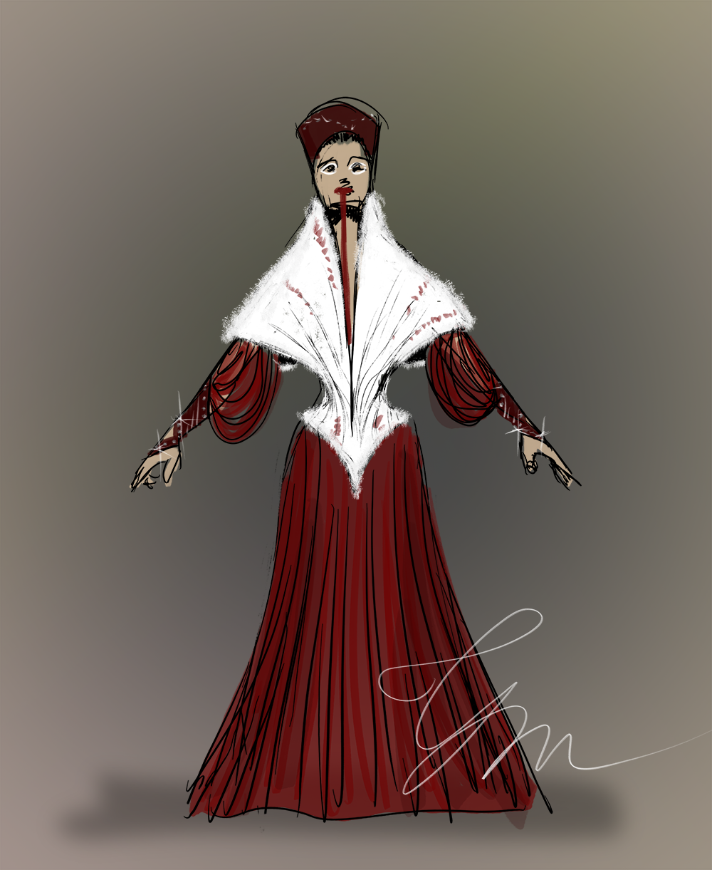 The base of the garment will be a waist cincher, properly built with all corsetry rules, with a front bush and back lacing. On it, I will create a texture similar to the one created for Game of Thrones, for the white and the white and red fur coats. It will be made from white long pile FAUX fur. I will make the sleeves and the skirt from soft pleated tulle, and the mittens from suede in a deep blood color.